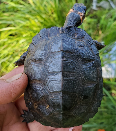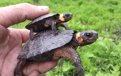 The bog turtle is North America’s smallest turtle, measuring only about four inches as adults. The northern population of bog turtles ranges from New York and western Massachusetts and south to Maryland. The bog turtle prefers to live in open canopy, unpolluted, herbaceous sedge meadows and fens bordered by wooded areas. They depend upon a diverse habitat for foraging, nesting, basking, and hibernating, and they can be a good indicator of water quality and wetland function.