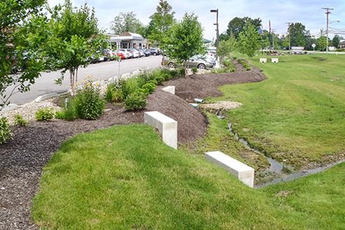Green infrastructure (GI) like infiltration basins, rain gardens, and bioswales use natural elements like rock and native plants to act as a filter for stormwater runoff, slowing down the flow of water while removing sediments and other pollutants before returning it to the sewer system, creating cleaner water that doesn’t overwhelm the sewer systems and water treatment plants or pollute nearby streams and wetlands while staying compliant with local regulations.