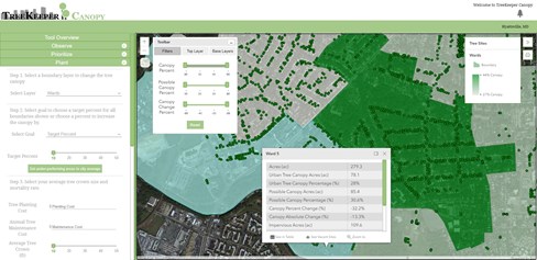Software that visualizes canopy data can be an immense help to create and achieve tree canopy goals. TreeKeeper Canopy, Davey Resource Group, Inc.’s proprietary software, allows users to upload their tree inventory data, isolate specific data sets, find vacant planting spots, and create work orders to streamline plantings. Seeing data in action can create a deeper understanding of an urban forest.