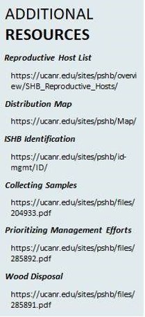 It is important to note that the presence of entry holes does not always mean that beetles are active or reproducing. With experience and proper training, individuals can learn to distinguish between active galleries and inactive galleries. If you are uncertain, use water-based paint to plug the hole and check for emergence in the coming days. If beetles are active they will push through the paint to expose the gallery opening. If you suspect that ISHB is present, submit samples to the County Agricultural Commissioner, the California Department of Food and Agriculture, or reach out to researchers and local arborists that can aid with identification. There are many look-alikes, so it is in your best interest to collect samples and confirm before taking further action.