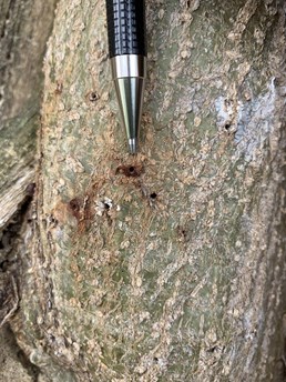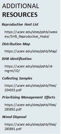 It is important to note that the presence of entry holes does not always mean that beetles are active or reproducing. With experience and proper training, individuals can learn to distinguish between active galleries and inactive galleries. If you are uncertain, use water-based paint to plug the hole and check for emergence in the coming days. If beetles are active they will push through the paint to expose the gallery opening. If you suspect that ISHB is present, submit samples to the County Agricultural Commissioner, the California Department of Food and Agriculture, or reach out to researchers and local arborists that can aid with identification. There are many look-alikes, so it is in your best interest to collect samples and confirm before taking further action.