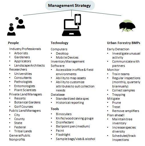 Research has found that the most successful means of coping with ISHB/FD is early detection and a rigorous monitoring program. Infested trees with high populations (more than 150 active galleries and branch dieback) are referred to as “amplifier” trees and should be removed immediately. If these trees are identified early and proper wood disposal methods are employed, land managers may be able to effectively manage beetle populations with targeted use of pesticides/fungicides. While there are some recommended treatments, they are only practical in certain urban environments and application may be limited based on site conditions (e.g., many products cannot be used near bodies of water).