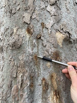 It is critical that land managers become familiar with the signs and symptoms of ISHB and that they stay up to date with the most recent findings. The list of known suitable hosts is continuously evolving as new species are discovered through intensive monitoring programs throughout the region. Train team members to recognize ISHB and encourage them to keep an eye out for symptoms while performing work on site. Remaining aware and vigilant will help your team identify amplifier trees before the beetles are able to spread. Visual identification of ISHB can be challenging, as each host species responds differently and symptoms may even vary within the same species depending on the host’s condition. When performing inspections, look for round entry holes, about the size of a medium ballpoint pen. Holes may not be visible if the openings are obstructed by frass, gumming or other exudates that are typically associated with this pest. Always look for unusual staining on bark and/or dieback of shoots and branches.